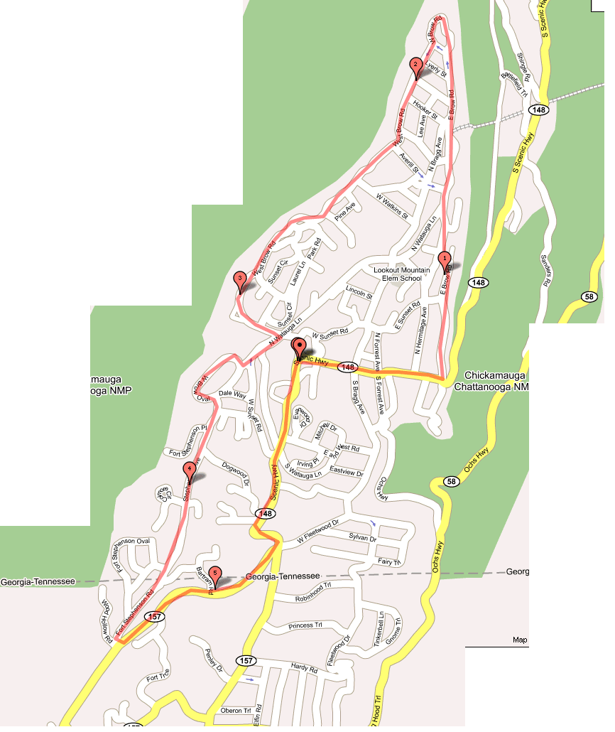 Start at the Lookout Mtn. Commons (also King Of The Mountain race start)